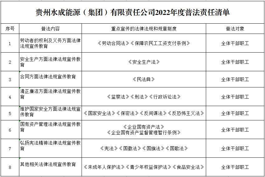 貴州水成能源集團(tuán)有限責(zé)任公司2022年度普法責(zé)任清單